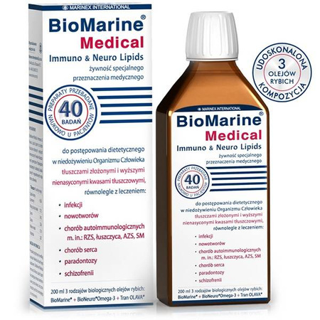BioMarine Medical Immuno & Neuro Lipids to żywność specjalnego przeznaczenia medycznego w postaci płynu do postępowania dietetycznego w niedożywieniu organizmu człowieka tłuszczami złożonymi i wyższymi kwasami tłuszczowymi. W swoim składzie zawiera mieszaninę tłuszczów rybich, głównie tłuszczów złożonych (alkiloglicerole, skwalen) i wyższych kwasów tłuszczowych wielonienasyconych z grupy omega-3 (EPA-kwas eikozapentaenowy, ETE—kwas eikozatrienowy, DPA-kwas dokozapentaenowy, DHA-kwas dokozaheksaenowy) oraz jednonienasyconych kwasów tłuszczowych z grupy omega-9 (NA-kwas nerwonowy, OA-oleinowy) substancji budulcowych i regulatorowych, niezbędnych organizmowi człowieka do uzyskania genetyczno-fizjologicznej działania, jak i budowy między innymi szpiku kostnego, układów krwiotwórczego, odpornościowego, oraz mózgu, układu nerwowego, serca i układu krążenia, a także systemu przeciwzapalnego.